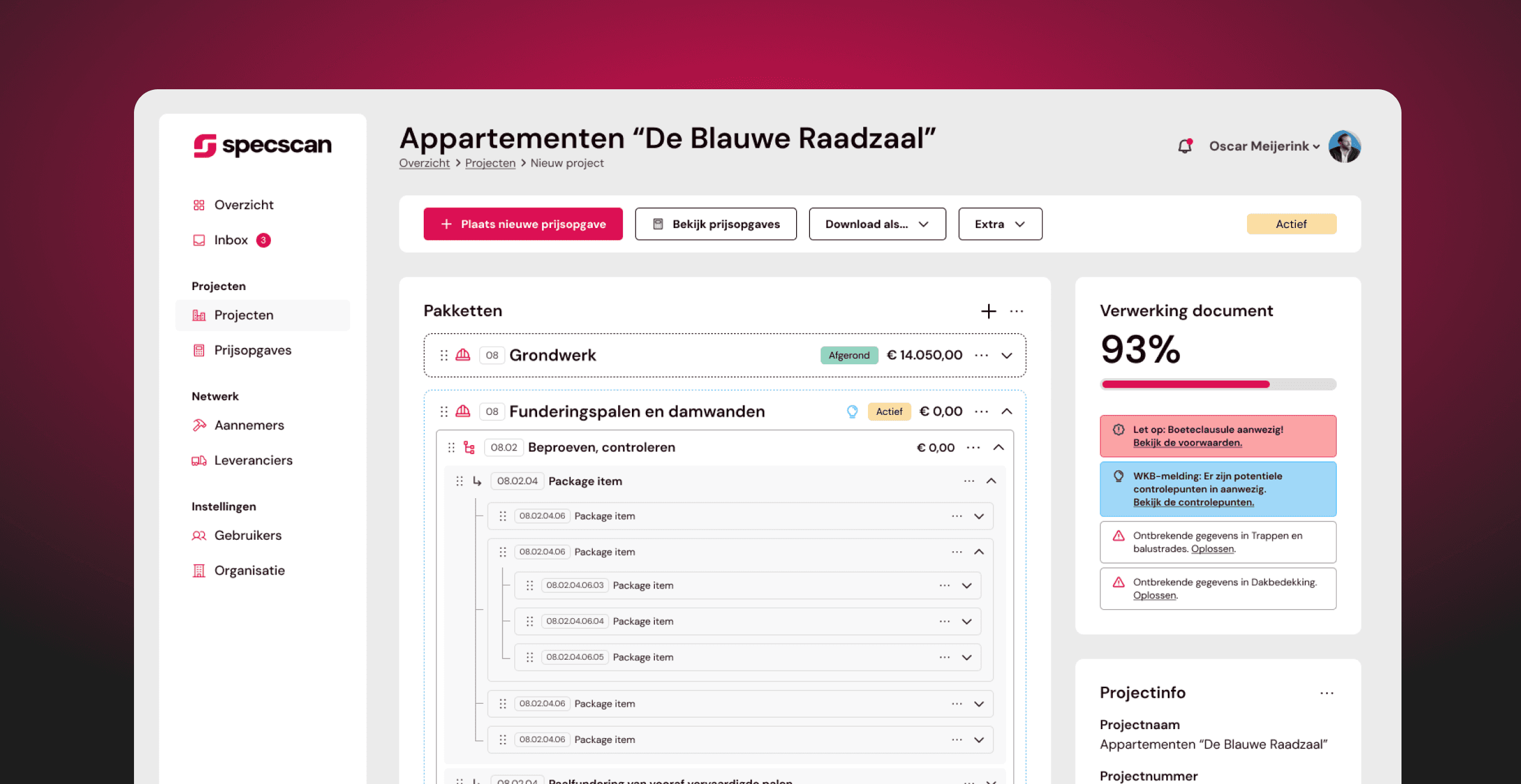 Specscan maakt complexe bouwplannen simpel. Dit AI-gedreven platform vertaalt technische bestekken en STABU-gegevens automatisch naar overzichtelijke werkpakketten. Elevn ontwikkelde de volledige UX-structuur en het visuele ontwerp van de applicatie. Samen creëerden we een intuïtieve interface die bouwbedrijven helpt efficiënter te werken, te schakelen met hun netwerk en sneller projecten te realiseren.